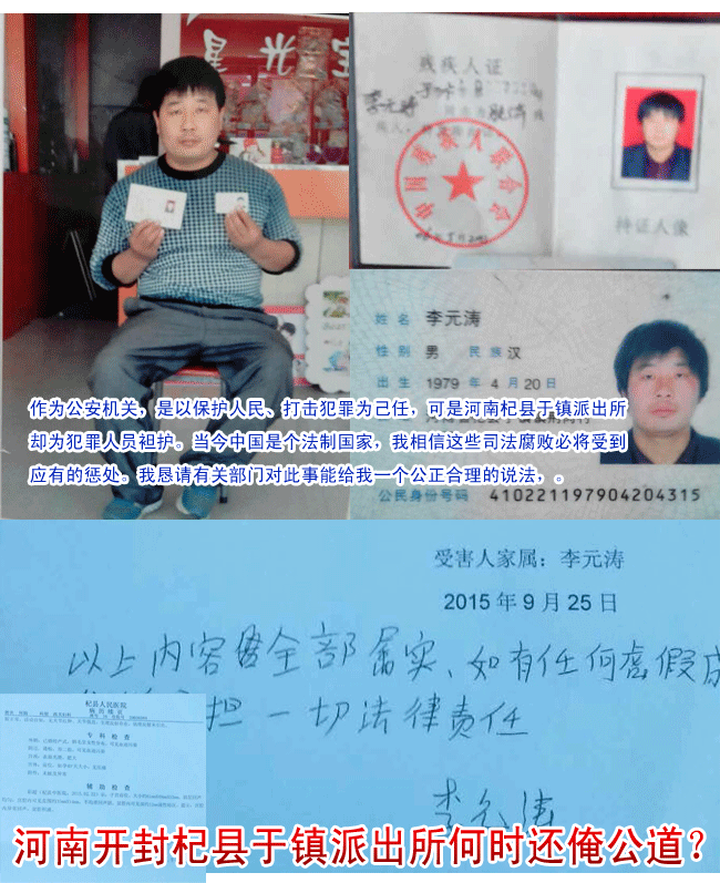 作为公安机关,是以保护人民、打击犯罪为己任,可是河南杞县于镇派出所却为犯罪人员袒护。当今中国是个法制国家,我相信在习近平主席的正确英明领导下,这些司法腐败必将受到应有的惩处。我恳请有关部门对此事能给我一个公正合理的说法。