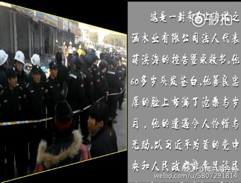 发稿人:蒋洪海,手机13501739375 身份证号是:310106195508122412,我所反映的绝无半点虚言,若有不实,我愿负法律责任。 原标题:上海君之涵木业有限公司法人代表蒋洪海的控告暨求救书 这是一封来自上海君之涵木业有限公司法人代表蒋洪海的控告暨求救书。他60多岁头发花白,他善良忠厚的脸上布满了沧桑与岁月,他的遭遇令人怜惜与无助。以习近平为首的党中央和人民政府非常关注民生,重视人民群众的疾苦。如今一些地方基层政府仍对人民群众的征地拆迁政策违规执行,涉嫌违法强拆,给人民群众造成重大经济损失,导致社会新的不和谐和不稳定因素。下面请听来自当事人蒋洪海的实录声音吧! 蒋洪海的实录声音 转载视频地址:http://player.56.com/v_MTM5OTM3NzMw.swf