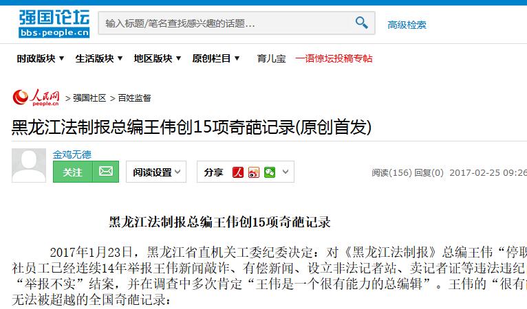 2017年1月23日,黑龙江省直机关工委纪委决定:对《黑龙江法制报》总编王伟“停职工作,接受组织调查”。报社员工已经连续14年举报王伟新闻敲诈、有偿新闻、设立非法记者站、卖记者证等违法违纪问题,省新闻出版局都以“举报不实”结案,并在调查中多次肯定“王伟是一个很有能力的总编辑”。王伟的“很有能力”体现在他创造了15项无法被超越的全国奇葩记录: