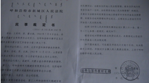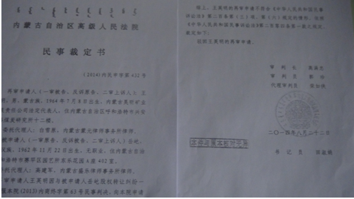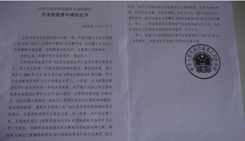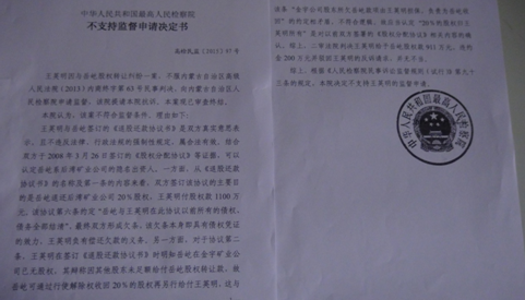 2013年5月17日,我收到呼市中院的判决书后,依法上诉到内蒙古自治区高级人民法院。高院的终审判决很快下来了,彻底纠正了呼市中院的错误判决,责令王英明在判决生效后十日内给付我股权转让款、违约金共计1111万元。王英明对高院判决不服,申请再审被驳回,于是又申请监督程序。内蒙古检察院向最高人民检察院提请抗诉,最高人民检察院下达了不支持监督申请的决定书。王英明又启动内蒙古自治区人大常委会即内务司法委员会执行监督,被呼和浩特市中级人民法院再次驳回,其又向内蒙古高级人民法院申请复议,再次开庭被驳回。