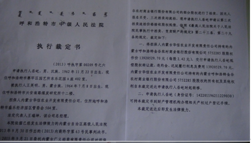 内蒙古高级人民法院的判决结果执行了长达三年之久,于2016年8月29日,呼市中级人民法院(2013)呼执子第00209号之六执行裁定书裁定:将王英明持有的内蒙古呼和浩特市金谷农村商业银行股份有限公司575.2万股的股权作价1392余万元过户到我名下。