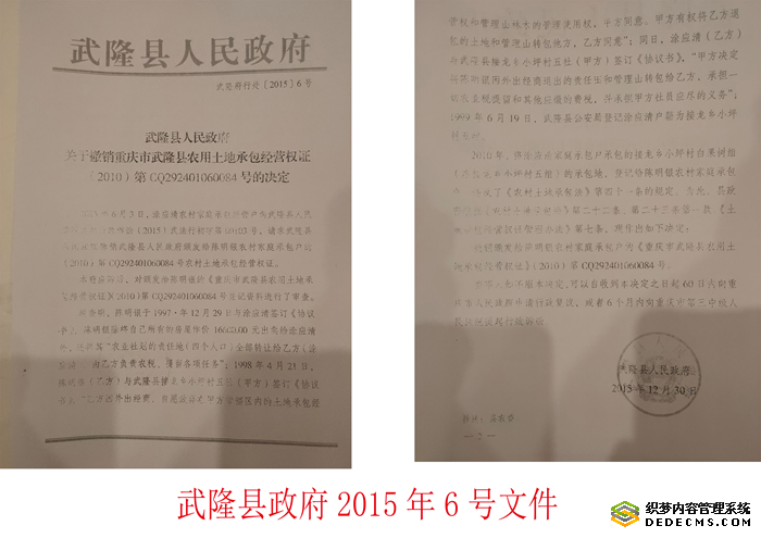 (2015)6号文件撤销重庆市武隆县农用土地承包经营权证(2010)第CQ292401060084号决定,已被武隆县人民政府(2016)8号文件撤销了。