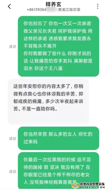 〖受害者〗试过,没有回复,并且养玄在东北没有踪迹了。他现在的公开身份在山西的多宝灵岩禅寺,人不在庙里。