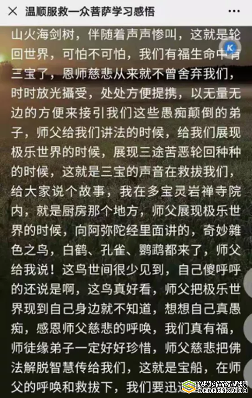 〖受害者〗他在群里头带动我们批判藏密,批判“四皈依”,但是呢,他做的就是让我们“四皈依”,只是名词上不这么说。他把那个他讲堂的三尊佛像都撤了,挂个牌子叫“温顺服救”。大家去讲堂看他的时候,都冲“温顺服救”那几个大字儿磕头。