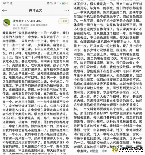 我是黑龙江省绥化市望奎一中的一名学生,我们这里的人以考上一中为荣。家长以孩子在一中上学为骄傲。一天从六点二十上课,中午十一点有时十一点二十才下课,一点就要离开宿舍去班级,一点二十就上课。下午五点或者五点二十吃饭,四十分钟,吃饭加休息。一直上课上到九点五十五。就因为这二十分钟的推迟,我们有多少次吃不上饭。甚至吃凉饭。明明两个食堂却只用一个。炎热的夏天,吃冰激淋停课。孩子们风华正茂的时刻,走廊打闹停课。在学校不穿校服停课。男女生单独在一起,通知班主任留意是否交往,难道兄妹也不可以吗。我讨厌一中,在新校区没建完就要我们在新校区上课,中午施工,半夜施工。不让孩子们睡好觉哪来的精神听课。但是,在班级睡觉,停课。吃刺激性气味的东西,停课。每天高负荷的学习量,真的很累。食堂吃出问题学校包庇,仅仅一年食堂负责人换了一个又一个。吃出三次问题,一个学生吃饭都不安全了,家长给送饭还不能在校内吃,必须在校外吃完才能进入校园。在食堂偶尔就能吃出头发丝或者小虫子之类的东西。学生携带手机就要劝退,还不归还。假如我是高一的,那么三年以后手机还能用吗,毕竟高一的学生,他们的手机都是考上一中家长奖励的。假如我是高二的,那两年以后我的手机功能是不是就退不了。假如我是高三的,一年不用,我的手机卡是不是会自动注销。体育课一周只有一节,如果体育课那天下雨,那不好意思这周没有体育课了。音乐课美术课?不存在的好吧。自从搬进这个校区一年,图书馆我就没去过,不让进也没时间进。每天的课程排满。心理课|和计算机课也不按规定去上,几周能上一次,还只在高一的时候有。现在是七月十四号,有多少地方没放暑假,我这里。高一刚刚放假,高二还在上课。明明正常的暑假变成了25天,高二的暑假变成10天。两周才放一次假,法定假日被缩短,高考,我们没放假;中考,我们没放假;省考;我们也没放假。亲爱的校领导,你们的脑子在想什么呢?老师不累吗?学生不累吗?我不知道别人,但是我很累,我这个住宿生很累,你们的连夜施工让我承受不起。你们的规章制度让我不敢恭维。本以为新校长来了可以让学校人性化一点,可没想到更加没有人性可言。女生宿舍,水房晾衣架丢东西,没人查,没人管,多少人丢了半截袖,袜子,甚至内衣内裤。男老师还可以看女生宿舍的监控,敢问这些老师你们觉得合情合理吗?学校不重视文科,一个文科老师要教好几个班级,甚至两个年级,那他们怎么备好课?每次放假回来回来都要带钱去交费,每天在订各种的资料,甚至有的老师没有,而学生却有。这种的只能被浪费掉,因为还有很多的没有去做。我讨厌一中讨厌一中的休假,讨厌一中各种的停课,讨厌一中对学生不动产的没收,讨厌一中吃不上饭的生活,讨厌一中睡不着觉的悲伤,讨厌一中的虚伪,讨厌一中的一切。哦对老校长是人大代表邹尚操,学校的老师和成年的学生都要去和他投票。呵呵。谢谢一中监狱。#望奎一中#