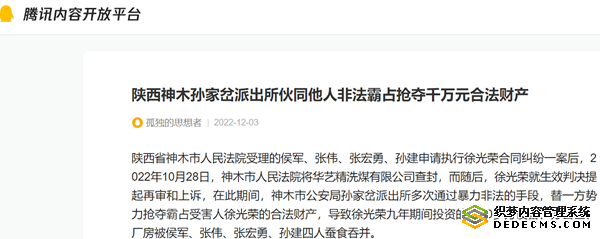 陕西省神木市人民法院受理的侯军、张伟、张宏勇、孙建申请执行徐光荣合同纠纷一案后,2022年10月28日,神木市人民法院将华艺精洗煤有限公司查封,而随后,徐光荣就生效判决提起再审和上诉,在此期间,神木市公安局孙家岔派出所多次通过暴力非法的手段,替一方势力抢夺霸占受害人徐光荣的合法财产,导致徐光荣九年期间投资的1700多万设备、办公区、厂房被侯军、张伟、张宏勇、孙建四人蚕食吞并。