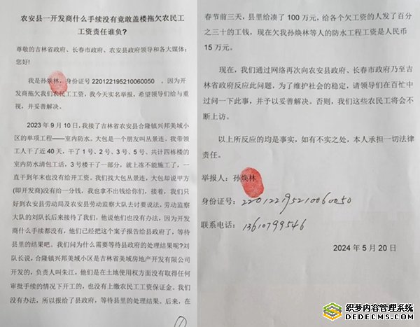 现在,我们通过网络再次向农安县政府、长春市政府乃至吉林省政府反应此问题,为了维护社会的稳定,请领导们在百忙中过问一下此事,并予以妥善解决。否则,我们这些农民工将会不断上访。