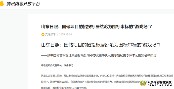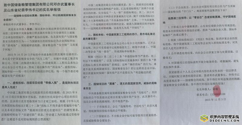 我是实名举报人梁毅,现以承担全部法律责任的郑重态度,向您二位举报中央储备粮日照直属库有限公司仓储项目土建施工总承包招投标中,涉嫌严重违法违规、危及国有资产与国家粮食安全的恶性行为。当国储项目的招投标沦为企业围标串标的“游戏场”,规则被肆意践踏,国家粮仓的“安全锁”又将置于何地?