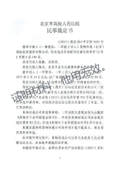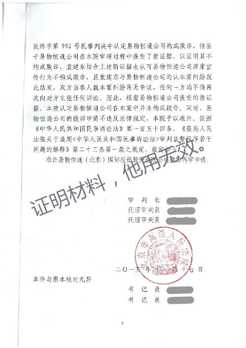 记者在2015年12月17日北京市高级人民法院出具的民事裁定书上看到,“本院经审查认为,虽然北京知识产权法院在(2015)京知民终字第992号民事判决中认定易物恒通公司构成欺诈,但鉴于易物恒通公司在本院审理过程中提交了新证据,以证明其不构成欺诈……因此,根据易物恒提交的新证据,本院认定易物恒通公司在本案中并未构成欺诈。”