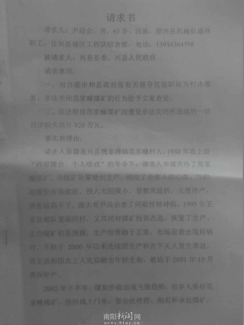 近日,本网记者接受群众来访,称山西省吕梁市兴县机械队退休职工尹迎会自1988年承包当地一家煤矿后被当地政府凭借职权打击报复、煤矿遭受非法关闭造成经济损失达920万元的事实。