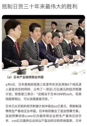2020年4月6日,日本首相安倍晋三宣布从空前的经济刺激计划中拨出22亿美元,帮助制造商将生产基地迁出中国。日本政府推出了追加预算方案,追加预算包括2200亿日元资助企业把生产基地迁回日本,235亿日元供企业将产业迁移到其他国家。也就是说,日本企业从此不在中国玩了,从此日本企业告别了中国。这是谁的悲哀,这是谁的不幸?