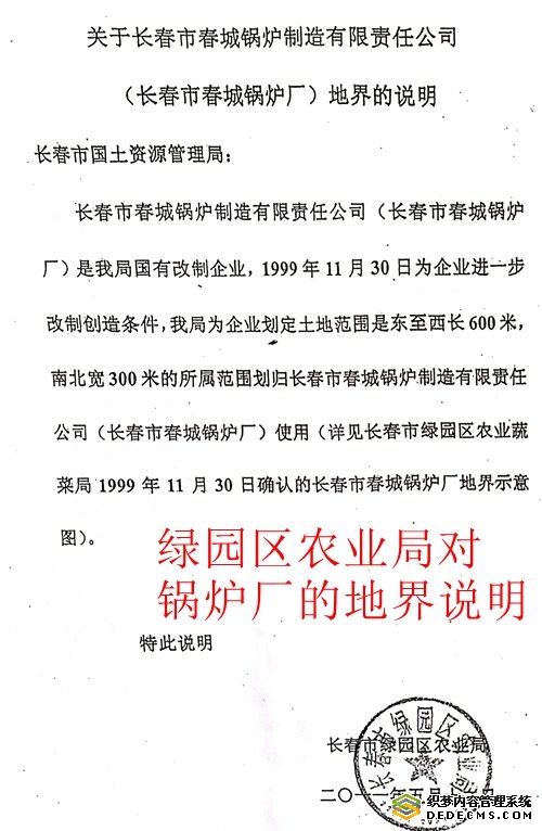 记者从汲长奎提供的材料中,看到长春市绿园区农业局加盖公章的《关于长春市春城锅炉制造有限责任公司(长春市春城锅炉厂)地界的说明》,该《说明》证实:“长春市春城锅炉制造有限责任公司(长春市春城锅炉厂)是我局国有改制企业,1999年11月30日为企业进一步改制创造条件,我局为企业划定土地范围是东至西长600米,南北宽300米的所属范围划归长春市春城锅炉制造有限责任公司(长春市春城锅炉厂)使用(详见长春市绿园区农业蔬菜局1999年11月30日确认的长春市春城锅炉厂地界示意图)。”