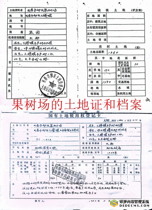 2002年12月19日,长春经济技术开发区国土局从经开区把手伸到二道区,跨区、越权,把不在其属地管辖区的果树场及锅炉厂土地登记在“长春经开区土地收储中心”名下,发放长经开国用【2002】0000165号114公顷土地证,面积超过果树场原土地证面积(103公顷)10多公顷。就这样一分钱没花,从法律上霸占了绿园区果树场和春城锅炉厂103公顷土地,经开区国土局没有通知当事人,随便就把别人的土地以“法律的名义”轻而易举占有了,其跨区、越权办理土地证,是严重的侵权、违法行为,为日后发生的一切埋下了祸根!