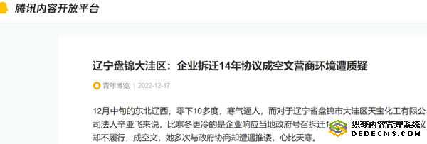 12月中旬的东北辽西,零下10多度,寒气逼人,而对于辽宁省盘锦市大洼区天宝化工有限公司法人辛亚飞来说,比寒冬更冷的是企业响应当地政府号召拆迁14年,当地政府签订的协议却不履行,成空文,她多次与政府协商却遭遇推诿,心比天寒。