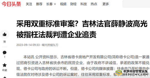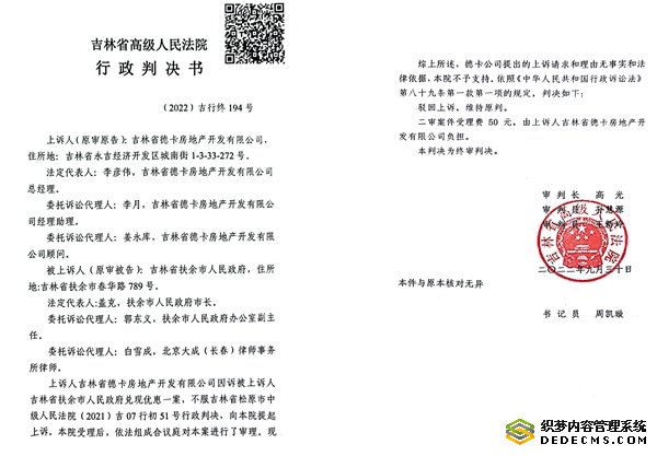 本站讯 公开资料显示,吉林省德卡房地产开发有限公司(简称德卡公司)是一家通过招商引资进入吉林省扶余市的民营企业,由于政府不讲诚信,承诺的政策不能兑现,德卡公司与政府的诉讼不断。但是,德卡公司向媒体披露:扶余市乃至松原市中级法院在对待涉及德卡公司的诉讼案时,往往采用双重标准,哪条法律对德卡公司不利,就采用哪条,这令德卡公司感到十分不公平。他们说:由于松原中院行政庭庭长薛静波、吉林省高院行政庭高光法官的枉法裁判,给我公司造成巨额损失,党中央、国务院一再强调要保护好民营企业,可是在扶余市,尤其是在扶余、松原两级法院那里,法官却与政府勾结起来坑害企业,甚至是政府与法院联手对民营企业进行谋杀!
