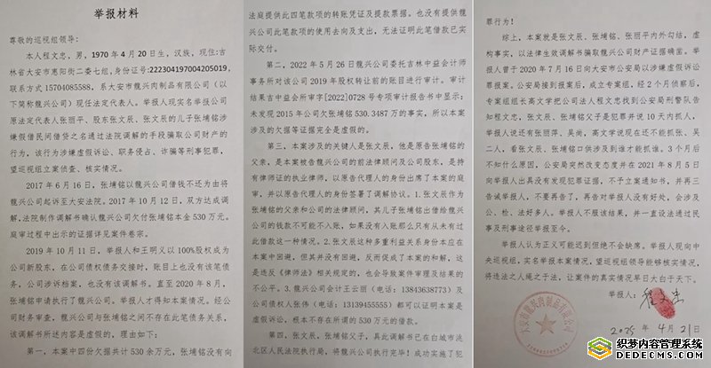 根据举报人提供的调解书显示,2017年6月,张埔铭(张文辰之子)以龙兴公司拖欠借款为由起诉,同年10月双方达成调解,法院确认龙兴公司欠付张埔铭本金530余万元及相应利息。“最奇怪的是,这笔所谓的‘借款’在公司财务账目中完全没有痕迹。”程文忠指出,他委托吉林中益会计师事务所对2019年股权转让前的账目进行审计,吉中益会所审字[2022]0728号报告明确记载:“未发现2015年公司欠张埔铭530.3487万元的事实。”