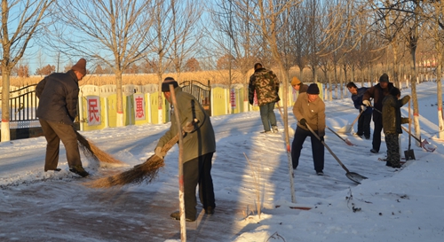 图1为甘河农场二十一队职工群众自发地组成突击队义务清扫队区积雪(周旭友摄)。