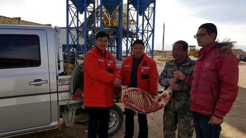 面对恶劣的自然环境,项目部坚持“以人为本”的管理理念,始终将员工生活作为一项重点工作来抓。11月12日,一批从一百多公里外远道而来的物资:猪肉、 蔬菜、棉被等,送到了一线施工者们的手中,同时也送达了项目领导对处在严寒中的一线职工的关怀,让一线职工在恶劣的自然环境、酷寒的天气中体会到了一份爱 护、一缕温暖。