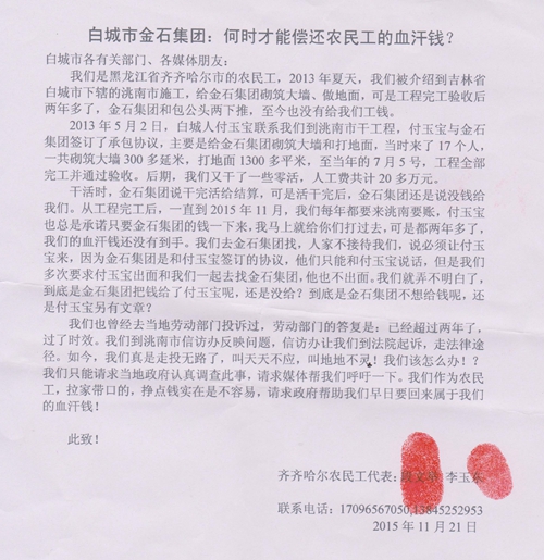劳动监察大队积极帮忙在金石集团求证之后,记者与农民工们一起来到洮南市劳动监察大队。一位姓王的大队长看了农民工的投诉信后,先是说按照规定,这不是我们受理的范围,因为过 了两年多了,已经超过我们受理的时效了,还有就是这是一个很小的工程,不需要像大的建设项目那样履行那些手续,说白了,就是给他们干一点小活,就像农村砌 个大墙,不在我们监管的范畴内,但是你们既然找到我们了,我们帮你们问问。他随后抓起电话先后给包工头付玉宝和金石集团打电话查问了一下,当得知对方确实 没有给付农民工工钱后,这位劳动监察干部发出警告:现在恶意拖欠弄民工工资是有法的!电话的那头,金石集团和付玉宝都承诺,下个月中旬,也就是12月15 号之前,一定解决好这个问题。