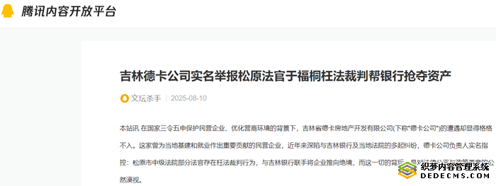 本站讯 在国家三令五申保护民营企业、优化营商环境的背景下,吉林省德卡房地产开发有限公司(下称"德卡公司")的遭遇却显得格格不入。这家曾为当地基建和就业作出重要贡献的民营企业,近年来深陷与吉林银行及当地法院的多起纠纷,德卡公司负责人实名指控:松原市中级法院部分法官存在枉法裁判行为,与吉林银行联手将企业推向绝境,而这一切的背后,是对法律公平与政策善意的公然漠视。