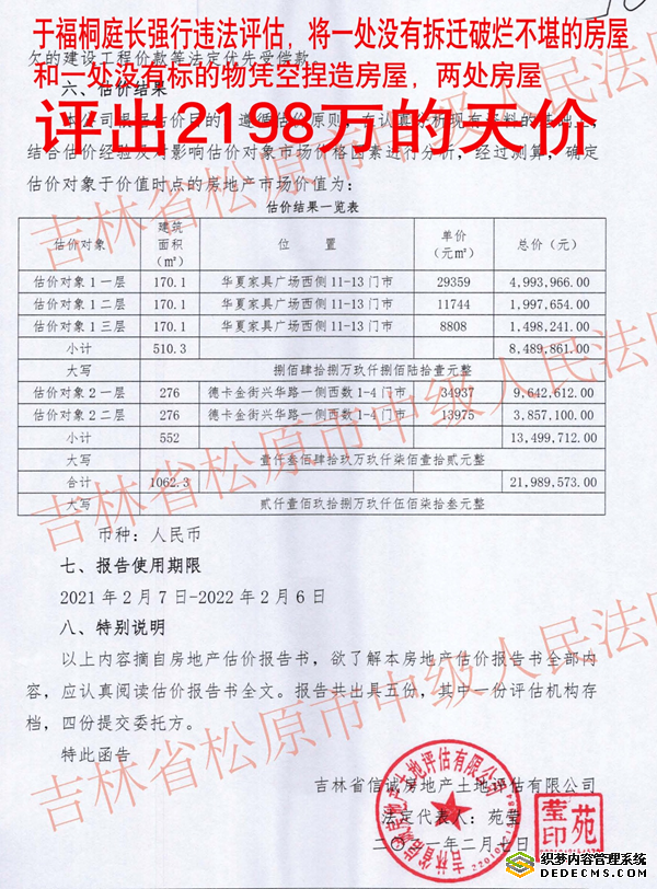 更令人震惊的是评估环节。据德卡公司提供的证据显示,银行原址其中一处华夏棚户区2007年至今已经18年扶余住建局没有拆迁完,导致银行起诉。现房产已"破败不堪、无商业价值",另一处因政府拓宽道路被占没。但于福桐庭长单方委托的评估公司却给出了"天价结论":华夏棚户区门市一层单价达29359元/平方米,在没有标的物的情况下竟凭空评出一层单价34937元/平方米,两处房产评估总价高达2198万余元,远超同地段新建商铺均价。