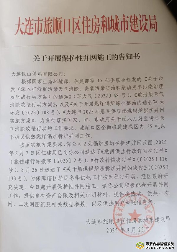 9月26日,大连盛阳供热有限公司变更新法人,9月25日,住房局就提前下发了“强并网文件”,将最初规划并入学园供热强行改为并入大连盛阳供热有限公司。而变更前后的两任法人从未与银山供热负责人张丽卿协商补偿意向,住建局提前用行政文件驱离民企“关停”,致使银山供热资产遭到强拆强占。