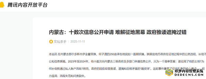 政府征地补偿本该透明公正,却沦为权力寻租的通道;信息公开本该保障公民知情权,却成了部门互踢的皮球。何子清一案,并非孤例,它是内蒙古乃至全国征地乱象的缩影——当政府以“发展”之名行强占之实,公民权益便成牺牲品。真相不大白,问责不落地,这类闹剧只会循环上演。何子清誓言穷尽法律途径:政府若不纠错,黑幕终将被撕裂。(记者魏民)