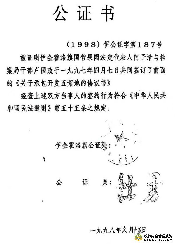 1997年4月,何子清与合伙人卢国政承包了伊金霍洛旗原果园的250亩“五荒地”(荒山、荒沟等)。承包程序严格合法:经果园职工联名认可,并由伊金霍洛旗公证处公证(公证书号:1998伊公证字第187号)。十数年耕耘,何子清投入巨资种植麻黄、松树,将荒沙丘变为“黄金地”,成为家庭经济支柱。但政府的征地操作,却将这份心血碾为废墟。