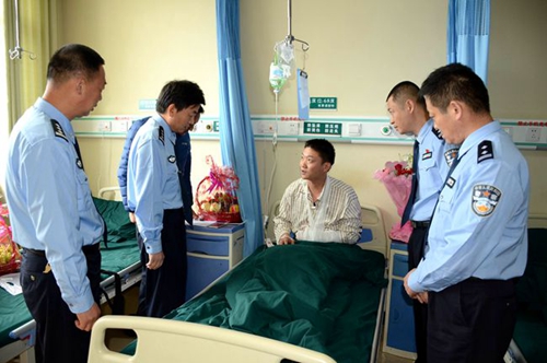 1月5号上午,副县长、公安局长蔡东赞,主管治安副局长李璋,局党委委员、政治部主任曾骋,治安大队长邹勇一同赶到医院看望慰问,详细询问了苏润坡的伤情和治疗情况。经医生介绍,苏润坡手部和腿部严重刮伤,左手掌骨骨裂。