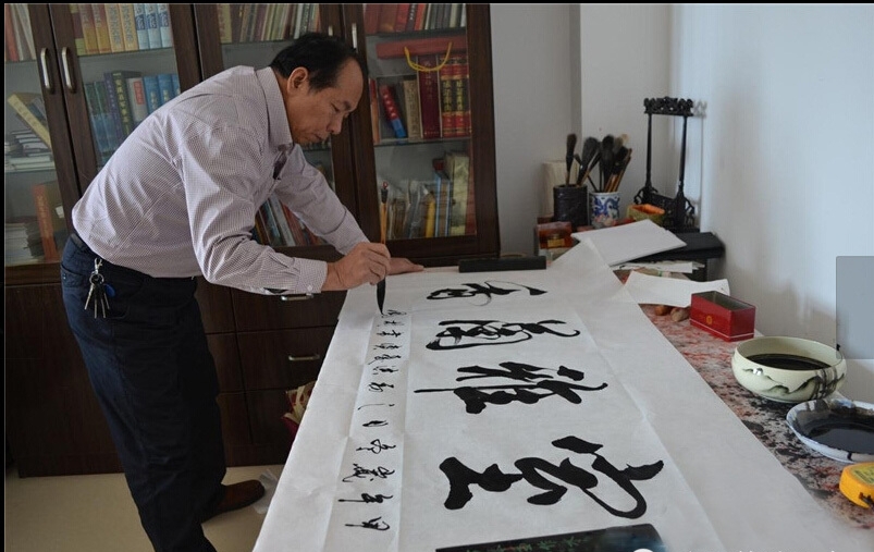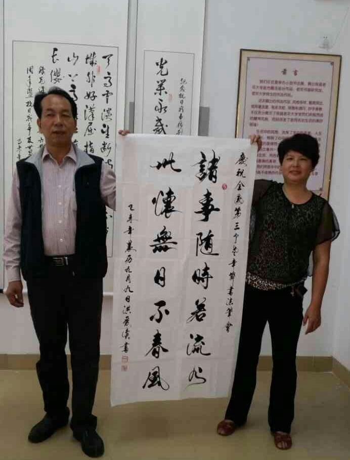 熟悉洪先生的人都知道他的书法造诣,书法本身只是自己的一个爱好,进而转变成生活中不可或缺的一部分。现任安溪县书法家协会顾问;安溪县海峡书画研究院名誉院长;泉州市书法家协会会员;中国书法家协会理事。先后荣获“首届中华国粹论坛暨《兰亭序》问世一千六百六十周年中华诗书画大赛”创作一等奖、“第30届伦敦奥运会●中华国粹题贺艺术创作活动”题贺艺术甲级作品、“第三届全国楹联书法篆刻大赛”联墨百杰提名奖、“梅花报春●第四届全国诗书画印四绝大赛”中华梅花艺术奖书法创作一等奖、“纪念毛泽东诞辰120周年书法美术摄影展”书法类佳作一等奖、泉州市“安全生产”书法评比三等奖等等,并入选《中国十大名花艺术大典》、《中国行书选集》、《中国梅花宝典》等书法著作。 “说起书法,就想起那一个源点。自己10岁时就接触毛笔字,13岁 时开始写春联。正是那一年的春节,父亲不识字,去集市上买红纸要让人家写对联,排了很久的队都没有等到。因为那时候过年,需要写春联的人非常多,就那几个 书法写得好的人可以写春联,可他们又忙不过来。父亲一气之下,就把那些红纸拿回家。问我,你不是识字吗?今年的对联就你写了。迫于形式之下,不得已只能拿 起手中的毛笔开始写了,这一写,一发不可收拾,自己便爱上了毛笔字。那之后,拜师点拨,临摹字帖,挥毫笔墨,会友探索,也因为书法结识了更多志同道合的朋 友。”洪先生饶有兴致的说道。 “书法就是自己的一个兴趣,没想到书法后来还能为广大民众服务。”自 打入职以来,洪先生每年都会买一千张左右的红纸,写上上万对的对联赠送给老百姓。平日里也会为老百姓编写婚丧喜庆对联,为学校、茶店、酒店等题词献字,只 要老百姓有需要。集字求观,无私奉献。书法作品大都以安溪乡土文化主题为主,同时涉及安溪茶文化、廉政教育、老年教育、毛泽东诗词、楹联和名人名言等,内 涵丰富,形式多样。书法可以修心养性,陶冶情操,自娱自乐,广交朋友,增进交流,促进和谐,锻炼身体,完成人生的自我理念,它还能增强记忆力,达到连气功 的作用。如果说:“工作满足了我的物资追求,那么书法就是丰富了我的精神追求。”洪先生一脸满足的说道。工作再忙也不忘回家看娘。