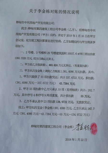 代理人回来后,将对账情况和安仲国财务提供的证据交给了李金栋,李经过六、七天的时间认真研究并核实了相关凭证,于2018年1月24日,给桦甸市第四建筑工程公司发出特快专递《关于李金栋对账的情况说明》。该《说明》称: