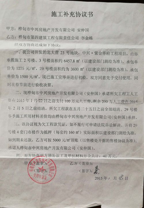 李金栋等建筑商向记者介绍:他是挂靠在桦甸市第四建筑公司和桦甸市中兴房地产开发有限公司(安仲国)签订的建筑施工合同,他和几个建筑商于2014年6月进入安仲国开发的“中兴●紫金华府”工程项目,到2015年初就已经验收交工,但是到现在安仲国也不与他们结算。“我们一去找安仲国算账,他就整一帮人来对我们连打带骂的”,几位建筑商愤愤不平的说。2015年1月18日,安仲国曾经与李金栋签订过一份《施工补充协议书》,在这个协议中,安仲国承诺:“现桦甸市中兴房地产开发有限公司(安仲国)承诺所欠工程工人工资在2015年1月22日之前支付100万元人工费。剩余200万人工费在2015年2月5日之前结清,所欠工程款在五月二十五日之前全部结清。29号楼冬季施工所用材料差价均由桦甸市中兴房地产开发有限公司(安仲国)承担。”“该协议视为欠工程款凭证,如不履行可申请法院诉讼解决,并将29号楼4套门市房作为抵押(每套约160 ㎡),实际面积以建设部门测绘为准。如到期未还款,乙方可按5000元/㎡顶账(以售楼处开据的售楼协议为准)。”“承诺人桦甸市中兴房地产开发有限公司(安仲国)”。但是,时至今日,安仲国在该协议中承诺过的事情不担没兑现,反而安仲国又将抵押给李金栋的4套门市房转卖了。