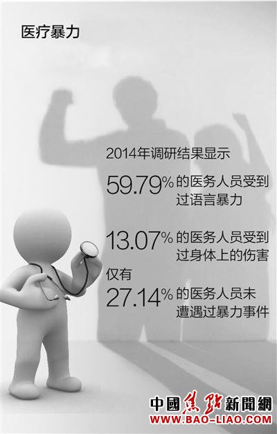 最近发布的《中国医师执业状况白皮书》显示,医疗暴力包括语言暴力和行为暴力。2014年59.79%的医务人员受到过语言暴力,13.07%受到过身体上的伤害,仅有27.14%未遭遇过暴力事件。根据医师协会调查统计,医师受到伤害事件逐年增高,医师普遍感到执业中的人身安全和人格尊严得不到保障。