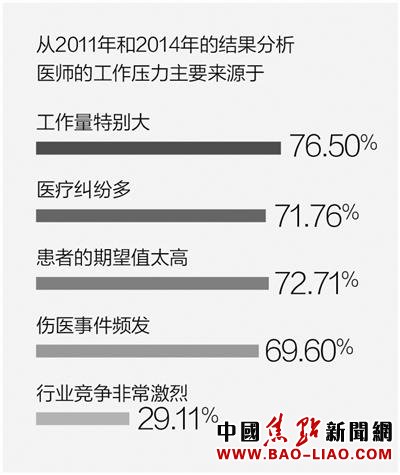 中国医师协会调查结果显示,医师的压力来源于工作量大、医疗纠纷多、患者过高的期望以及伤医事件。其中,患者的期望值太高占72.71%,伤医事件频发占69.6%。医师们越来越不希望子女报考医学院校,2014年不希望自己子女从医的比例高达64.48%,这进一步印证了医师对执业环境不满意,进而影响到职业成就感的评价。