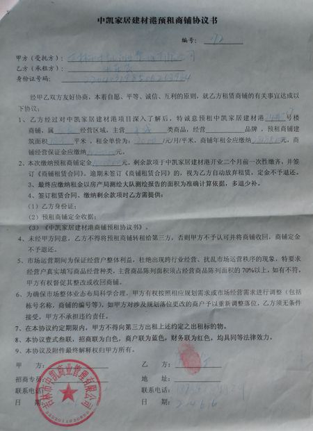 据张俊琴、张丙顺介绍:他们是2014年10月份来到这里的,当时是以招商引资的名义被招来的,中凯物业当时承诺可以先住着,等到开业了再交房费,于是双 方签订了《中凯家居建材港预租商铺协议书》,张家交了一万元保证金,就开始进入。之后,他们又花了10多万元,将房屋进行了装修,之后便开始试营业了。可 是,他们入住后才发现,这里的生意并不像当初被招来时候招商者说的那样好。到了今年6月20日左右,中凯物业要求他们这里的20多家小饭店签订新的合同, 一些商户告诉他们:中凯物业提供的新合同上有很多空格,说白了就是空白协议,还不让商户们看就让签字,于是他们和另外几家就始终没有签。由于他们不签合 同,中凯物业有个姓于的经理和一个叫做王春光的副经理就带着人将他们的自来水给关了,他们去找物业公司,但是中凯物业的态度很强硬,坚称:“不签合同就不 给恢复供水!”无奈,他们又去找供水公司,供水公司马上就来人恢复了供水,并告诉他们:物业没有任何权力给商户或者住户停水,中凯物业私自停水是违法的! 但是后来,中凯物业又来人把他们的水给停了,他们又去找供水公司给恢复了。还有一次,被物业停水后,他们到派出所报了案,派出所介入后,自来水马上被恢复 了,也就是从那以后,他家的供水才正常了。