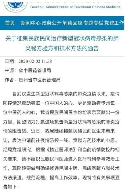 贵州,是中国中药材四大产区之一,对中医药也是很重视,也很注重民间中医力量。在这次抗疫中,贵州省中医药管理局曾经官方发出了《关于征集民族民间治疗新型冠状病毒感染的肺炎秘方验方和技术方法的通告》,算是全国独一份。在发出这份通告之前,贵州中管局陆续接到民族民间医生来电来访,表达申请前往疫情防控一线,贡献方药技术的心愿。虽然最后受《执业医师法》限制,贵州也没有组织民间中医进入医疗机构参与救治工作,但却开通了民间中医献方献技术方法的渠道。