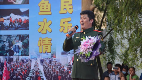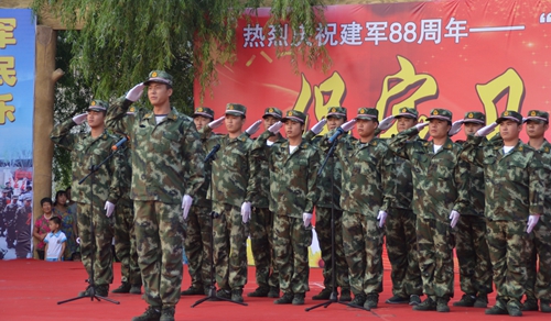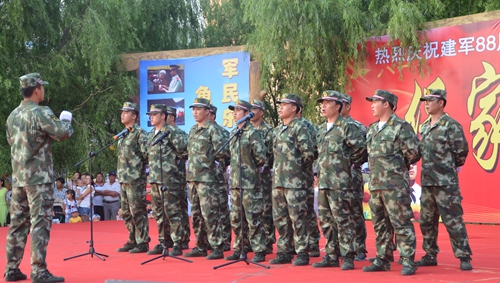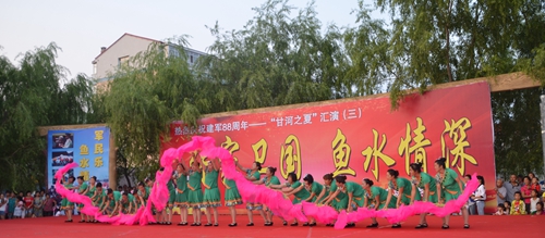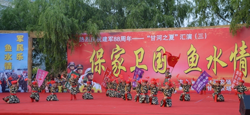本站讯 民拥军,军爱民,军民一家亲。为庆祝中国人民解放军建军88周年,7月30日晚,内蒙古呼伦贝尔农垦大兴安岭垦区甘河农场举办的庆“八一”“保家卫国、鱼 水情深”文艺晚会在亲和广场举行。农场退伍官兵与职工群众共2000余人欢聚一堂,共同庆祝“八一”建军节。晚会上,农场首先对今年新考入重点大学、海二中、牙林中的农场学生及优秀教师颁奖。退伍战士们合唱的《咱当兵的人》、《好男儿就是要当兵》振奋人心,战士 们英姿飒爽,步伐铿锵有力;主持人还饱含深情地朗诵了《我的中国梦》;农场民间艺人的一曲《想家的时候》展示了军人们一腔热血、拳拳报国之情;接着,刘鸽 等9学生的葫芦丝合奏《映山红》展示了军民团结一家亲;歌曲《小白杨》抒发了年轻人对军人崇敬与信仰;杨阿姨幼儿园30名小朋友们表演的舞蹈《我们的钓鱼 岛》,更是激发了在场所有观众爱国激情,迎来了观众的阵阵掌声和欢呼声,把晚会推向高潮……。精彩纷呈的节目让在场的职工群众连声称赞,整场晚会节目形式 多样、内容丰富,节目融艺术性、娱乐性于一体,为大家送上一场文化与艺术的盛宴。