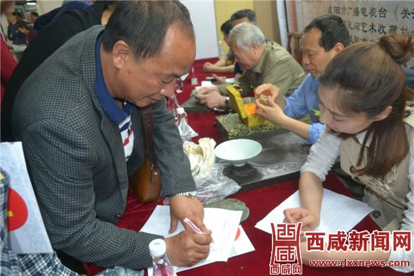 鉴定团专家王珰荣老师认真细致的为收藏爱好者鉴定玉器