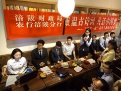 接下来,涪陵区财政局、农行涪陵分行的才子才女们展示了词、诗歌、以及自创的古文“沧浪歌”给予了大家分享;财政局张树森和农行查程祺两位才子用豪迈的嗓音朗诵了一首“念奴娇•赤壁怀古”,财政局游茜和农行刘韦辰两才女朗诵李清照的《声声慢》将活动推向高潮,赢得掌声不断。还有农行才子张行为大家朗诵了范仲淹的《岳阳楼记》,张行的精彩演绎赢来阵阵掌声。