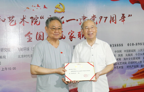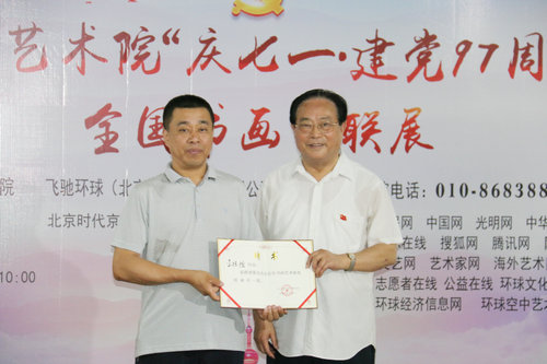 郭玉祥为北京师白艺术研究会会长娄述德颁发名誉院长证书