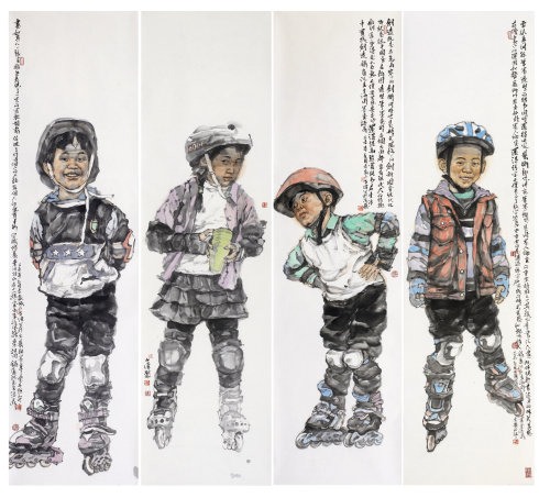《收获的季节》、《守望家园》、《快乐家族》、《都市快乐一族》、《追风少年》这些作品大都是我在研究生期间创作的作品,她们见证了我的进步和成长,使我对水墨和造型有了更深的认识和思考,也明确了我的绘画之路是“为艺术而艺术”还是“为人生而艺术”。