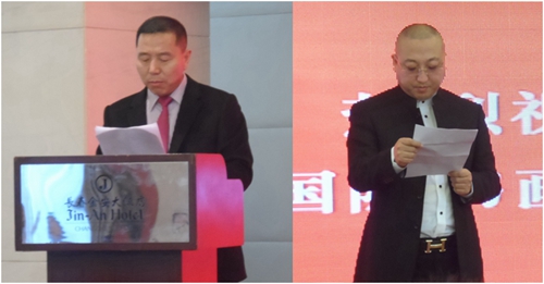 本站讯(记者李广军)2015年10月25日上午10时30分,吉林省长春市金安大饭店门前人流涌动,气氛喜庆而热烈,由盛宏地产董事长刘刚先生和我国著 名书法家许锋先生共同发起、创办的吉林省首家国字头的国际书画院——中国翰墨国际书画院成立大会在这里隆重举行。吉林省及长春市有关领导、书画家及各届书 画爱好者出席了成立大会。盛宏地产董事长刘刚先生在成立大会上致辞,中国著名书法家、中华悬纸书法创始人、中国翰墨国际书画院院长许锋先生致答谢辞。