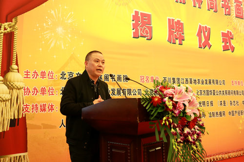 活动现场,六届全国人大常委江家福宣布揭牌仪式开始、北京文曲翰林阁书画院院长齐国章、执行院长周智慧、国务院办公厅行政司原副司长王胜利、人民日报《新闻战线》杂志社专题部主任何鹰、北京大学法学院原副院长朱启超;百川集团百川文化传媒有限公司总经理谢玉泉、青年书法家代表孙文圣分别发言和致辞;中华志愿者协会综合办公室副主任李强、著名书画家沈丽洲女士、中国国宝书画研究院对外联络部主任董铁棍代表中华志愿者协会文化艺术委员会、中国国宝书画研究院向北京文曲翰林阁书画院成立赠送书画作品以示祝贺;随后,江家福、胡钦佩、李彰、王胜利、张文怀、刘志林、韩文博、潘万里等嘉宾、艺术家代表个人向书画院赠送作品以示祝贺。