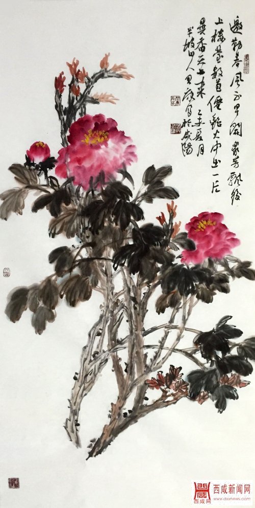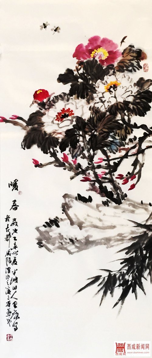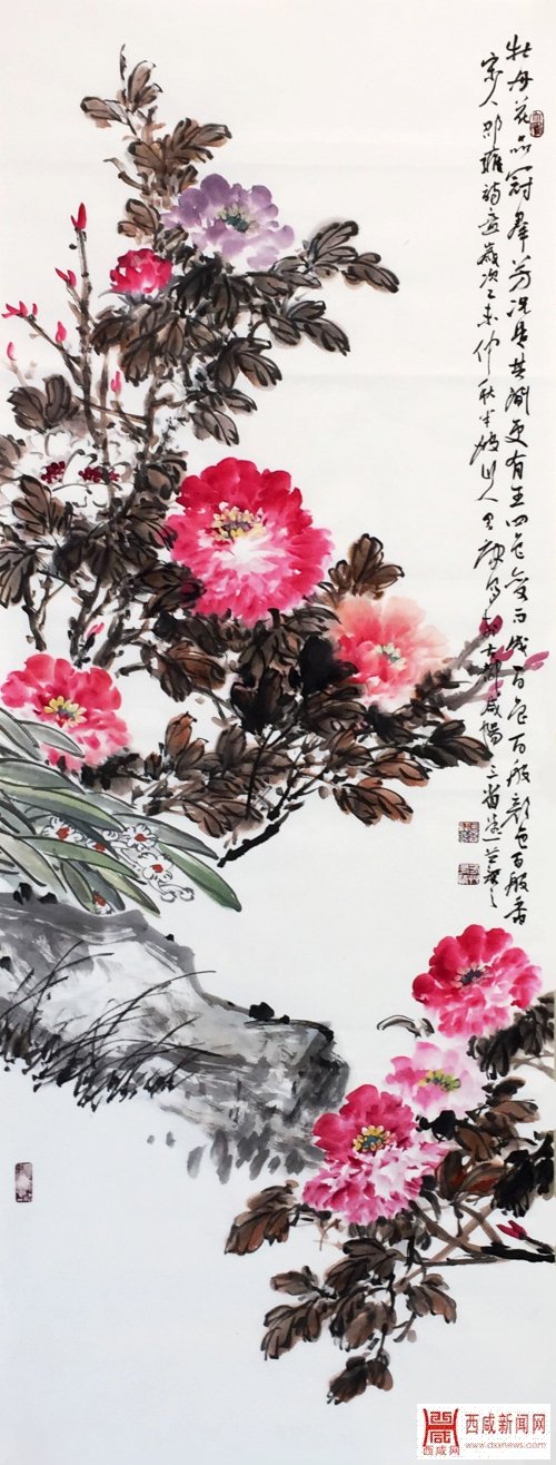 烟是神仙的化身,是吞云吐雾的飘渺,是劳作之后的惬意,是茶余饭后的逍遥。在别人眼里,烟是一种潇洒,但在吸者嘴里,那是一种极乐中的苦涩。大家看到的 是安君康的云游四海,是他的无限风光。作为挚友,我更多见到的是安君康的忧虑和沉思。按理,他的花鸟画已到了一个比较高的艺术层面,圈里圈外也有了不错的 社会影响,但他想到的是技法的精进,是艺术内涵的进一步延伸,是传统的突破。就拿他的牡丹画来讲,他把那种雍容华贵、娇艳欲滴的约定俗成的风格已发挥得淋漓尽致,但他想到的是牡丹的品味,是牡丹的文人风骨,是牡丹的灵秀,是牡丹的风姿绰约。为此,烟成了他的知己,于笔墨纸砚的寂寞当中,于夜阑人寂之时,于前辈的成规之中,他苦苦探索,另辟蹊径,期望心想事成。