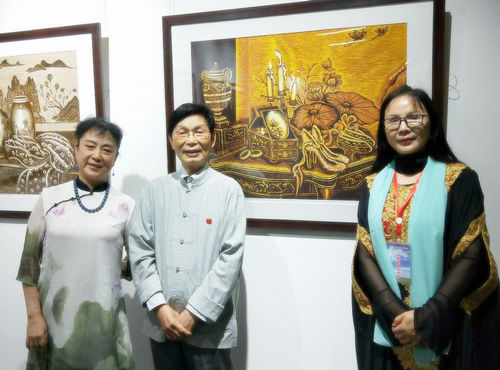 沈春霞与解放军某高校原政委林继福将军及夫人在自己作品前合影留念