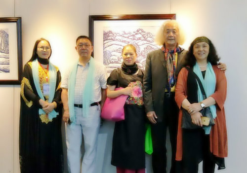 沈春霞与中国国家画院常务副院长卢禹舜;丝绸之路城市联盟顾问张正;著名影视剧演员、电影《渡江侦察记》中刘四姐的扮演者者、《从奴隶到将军》中索玛扮演者张金玲在画展现场合影留念