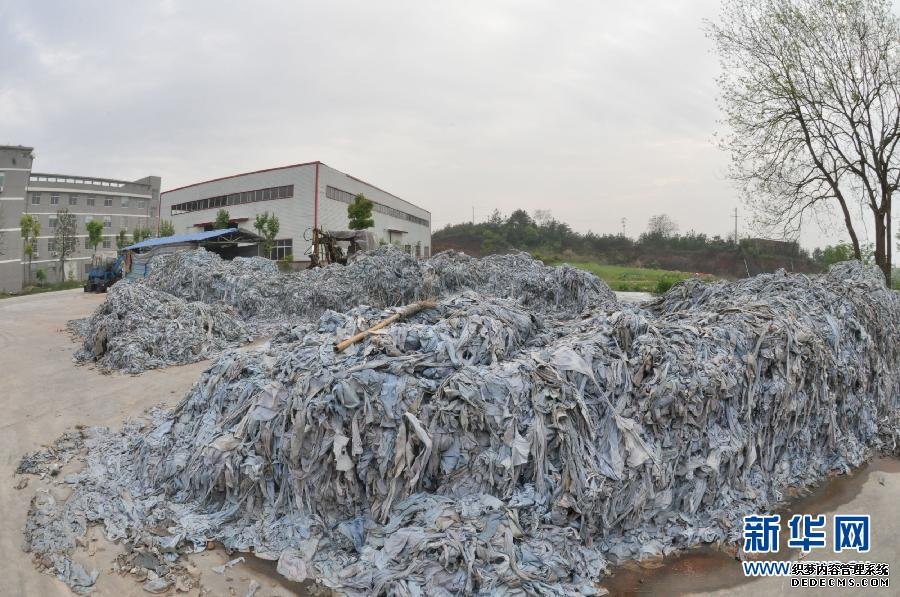 4月17日,江西省弋阳县龟峰明胶公司露天水泥地上堆满用以制造明胶的废弃皮革边角料。江西弋阳县龟峰明胶有限公司制售问题明胶一案被媒体曝光后,弋阳县有关部门对该厂作出停厂整顿的处理,原材料和产品被查封,公司董事长李明元及另5名相关人员已被公安机关控制。目前,弋阳县质监、公安部门正对该公司生产的工业明胶数量和销售去向情况进行详细调查核实。新华社发(张卫国 摄) 图片来源:新华网