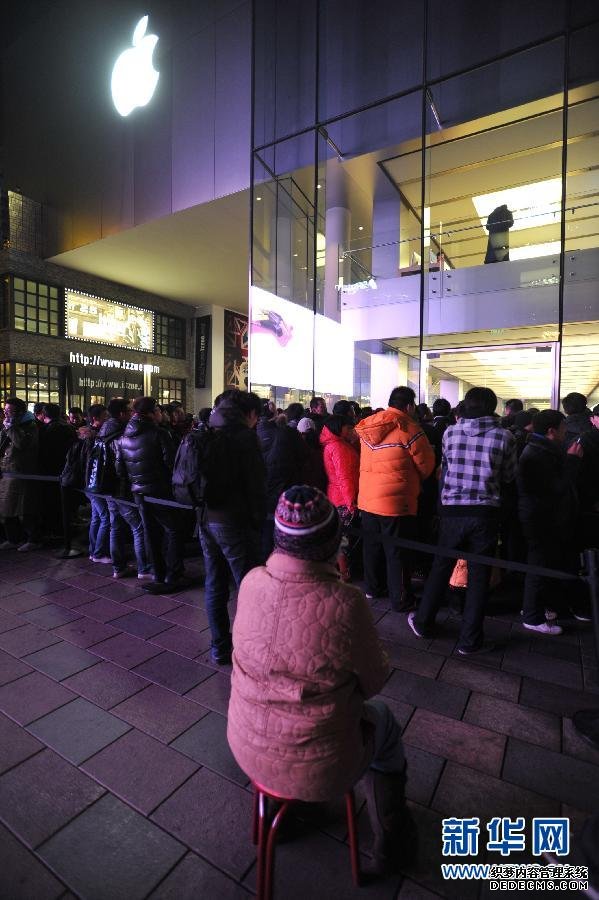 1月12日晚,在北京三里屯苹果零售店门口,“果粉”们通宵排队准备购买iPhone4S手机。苹果公司最新一代智能手机iPhone4S于1月13日起在中国内地上市。此次开卖的iPhone4S共有黑、白两款,有16GB、32GB、64GB三种机型。新华社发(刘长龙 摄)