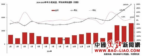 2014-2015年中介促成量、环比与同比走势(宗数)