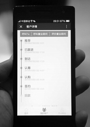 “这款软件购房大致需要经过推荐、到访、认筹、认购、签约等环节,购房者每完成购房一步需要置业顾问一步步点击才能继续往下走。”姚志文说,但是他的软件 进度上显示,只有7月22、25日两次完成推荐、已跟进、到访,而明明7月24日完成的认购,软件上显示的却是10月12日。所以,姚志文和朋友刘正月表 示,现在他们怀疑置业顾问高女士故意不点击,而让徐女士继续点击,采用欺瞒手段最后达到冒领佣金的目的。